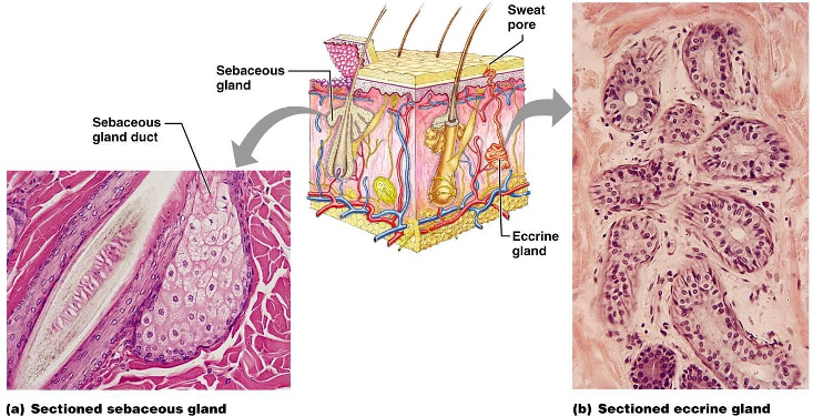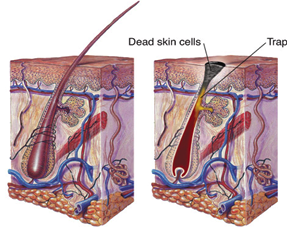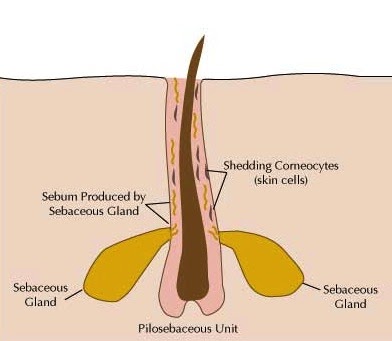 毛穴は、Pilosebaceous unitという構造になります。すなわち毛穴には必ず皮脂腺と言われる毛穴を大きくしてします器官がついています。 は皮脂腺(Sebaceous gland)です。 皮脂腺は皮脂を常に生み出し、皮脂(Sebum)は毛穴を通じて皮膚の表面に出ていきます。また、皮膚の角質は毎日死んでいき、その角質の死んだ細胞も皮脂と一緒に毛穴に落ちていきます。(下図参照) ▲毛穴は皮脂(Sebum)と、角質(Corneocyte死んだ皮膚)で埋まっています。