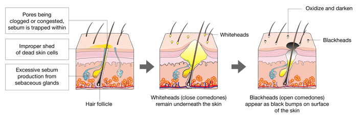 という「皮膚のハリの減少」が原因となっています。 症状が悪化すると、毛穴の開きだけではなく、ニキビができたり、毛穴周囲の組織が完全に崩れニキビ跡、クレーターができるまでになってしまいます。 ▲毛穴に過剰に蓄積された皮脂はまず見た目では「黄色の点」になり、それが酸化してくると、 黒い点となり、毛穴が「黒い点」として認識されます。そして、それに細菌が感染すると いわば、毛穴の開きというのは、ニキビの前段階でもあるわけです。