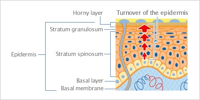 過剰な角質に対しては、Microsurgery(手術)による毛穴(毛包)上部の余分な角質の除去を行っています。周辺組織にダメージを与えずに、毛穴に詰まっている角質を高度な技術で、ピンポイントにダイレクトに取り除きます。(下図参照)東大病院などの皮膚科診療でしか習得できないような皮膚表面および内部の構造の正確かつ詳細な知識が必要となります。 ▲右の画像の黒い部分(Dead skin cells:角質)を取り除きます。 また、皮膚の細胞のターンオーバーのサイクルを早め、過剰な角質が溜まるのを防ぐ治療も併用します。皮膚は基底層(Basal layer)と呼ばれるところから、角質まで徐々に変化しながら上ってきます。そのスピードを早める事により、皮膚の細胞を若返らせ、角質の余分な死んだ細胞を皮膚から素早く除去し、毛穴に過剰に溜まってしまう事を予防します。 ▲皮膚(Epidermis)の細胞が基底層(Basal layer)から角質(Horny layer)までどんどん上がっていくイメージです。 角質には死んだ細胞が溜まっています。